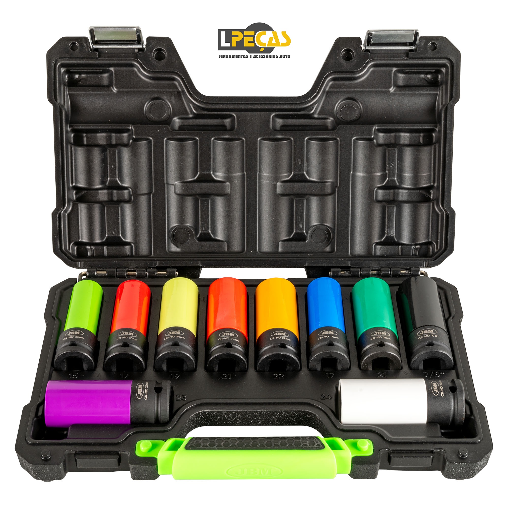 – 7 chaves hexagonais da 1/2 ” de 15, 17, 19, 21, 22, 23 e 24 mm