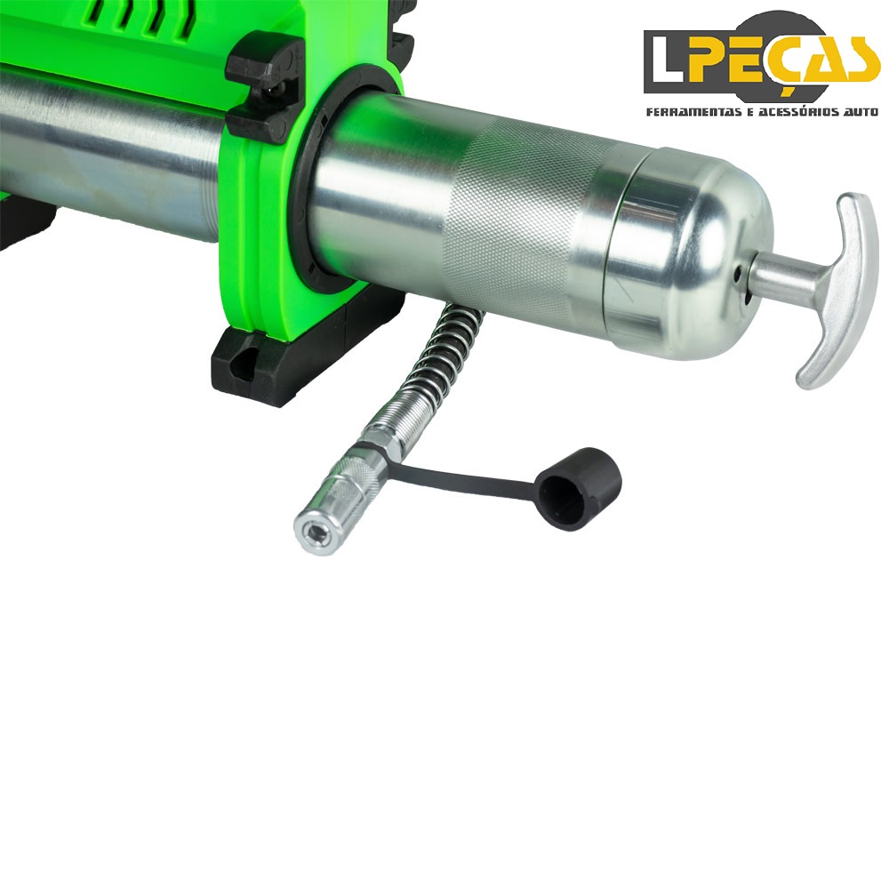 Esta ferramenta é uma pistola de graxa. Alimentada por bateria, a ferramenta é fácil de usar e transportar.